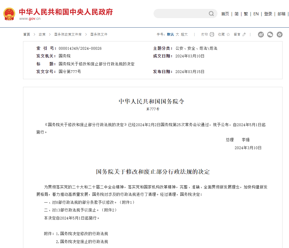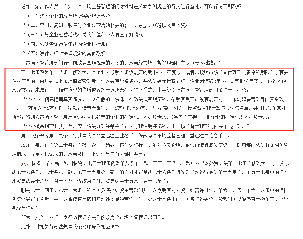 2024年3月10日,李强总理签署国务院令,公布《国务院关于修改和废止部分行政法规的决定》,在公布的《决定》中第七部分对工商年报有做出明确规定,企业不按期做工商年报的,由市场监督管理部门列入经营异常名录,并依法给予行政处罚。该决定自2024年5月1日起实施。新规详情如下: